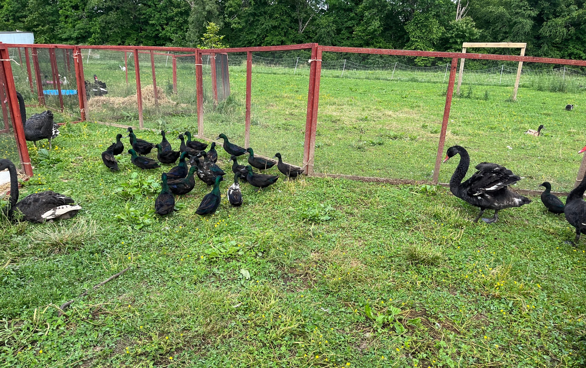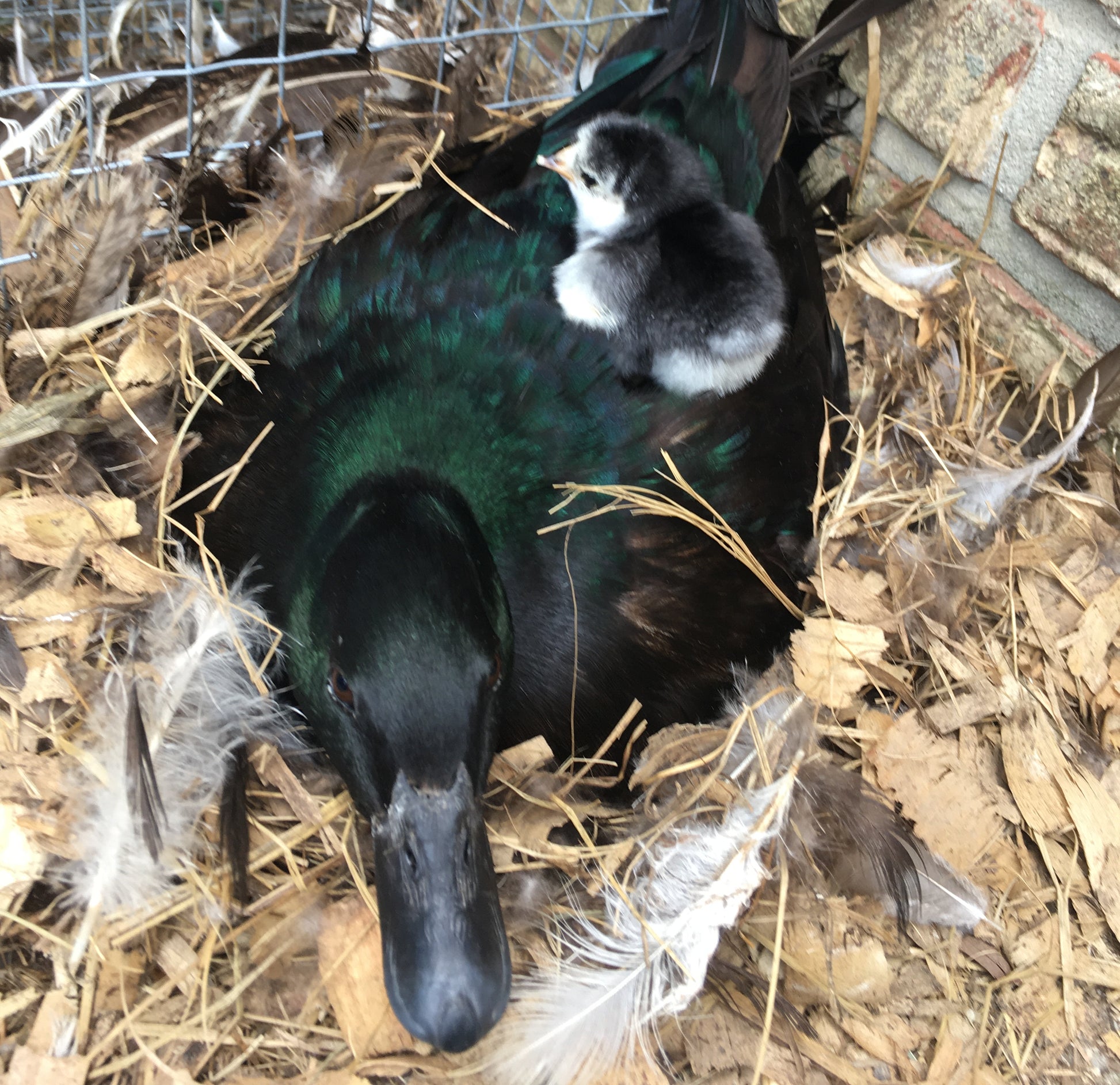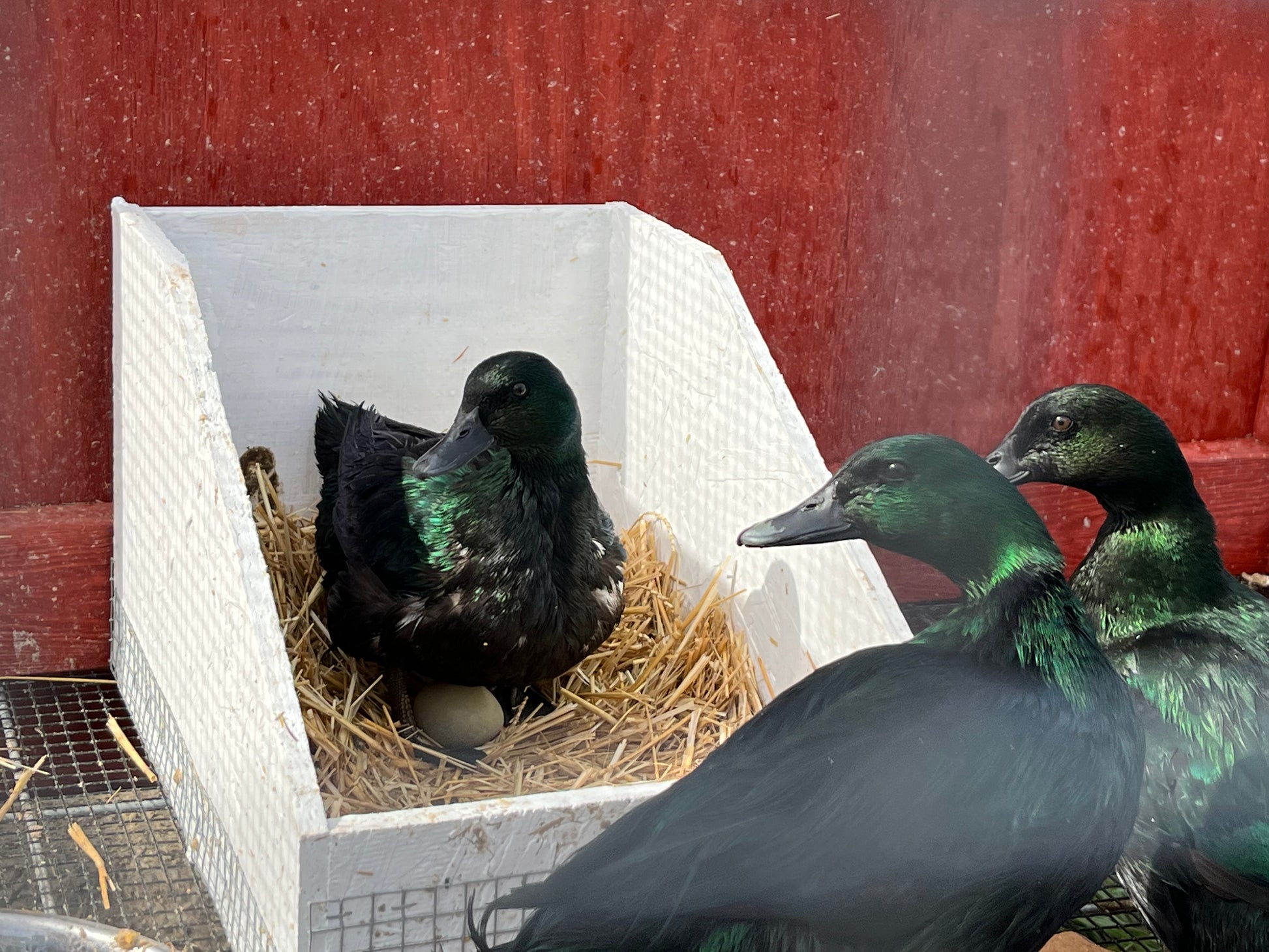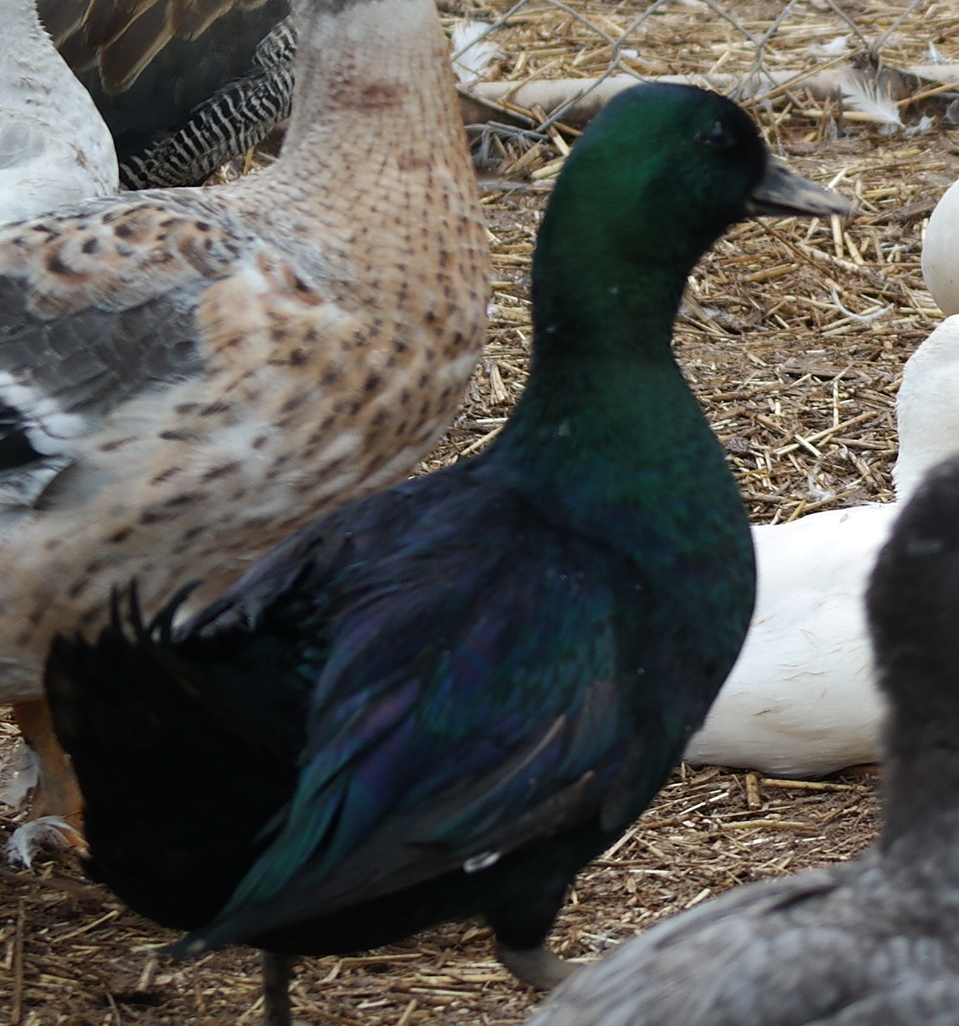 Bantam ducks, iridescent green with longer bills and bodies compared to call ducks. They are great mothers!