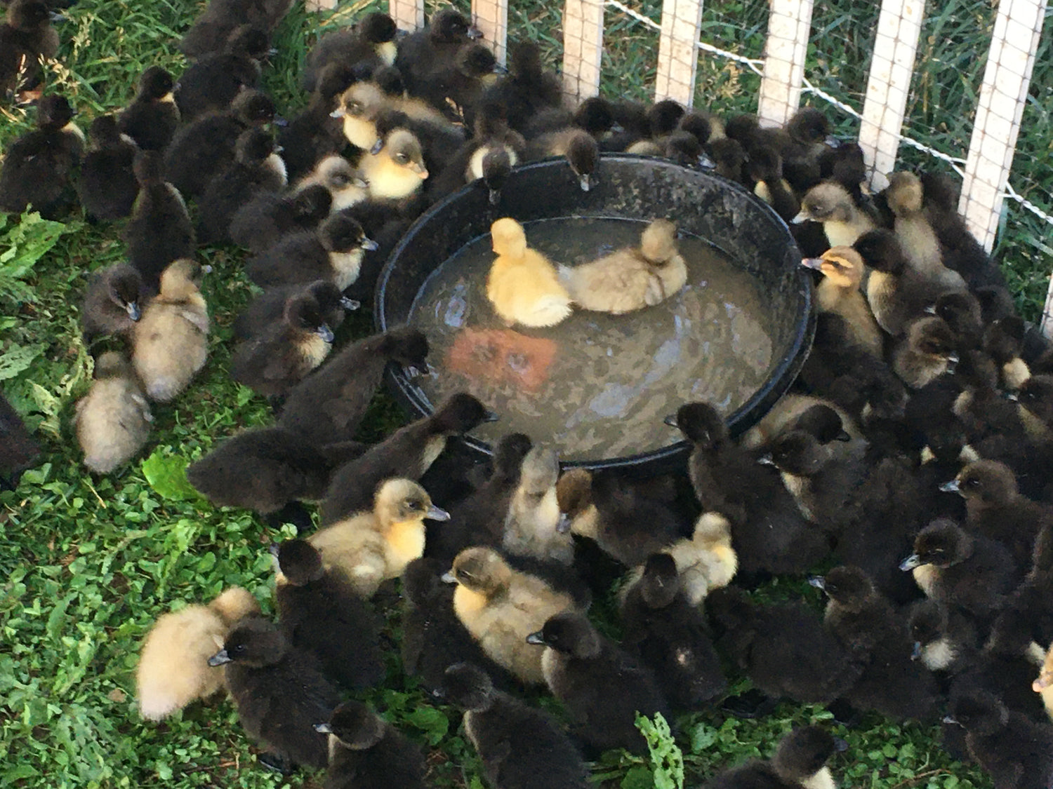 Ducklings love to swim. Be sure water bowls are not too deep and they are always able to climb out when most of the water is splashed out—rocks work well.